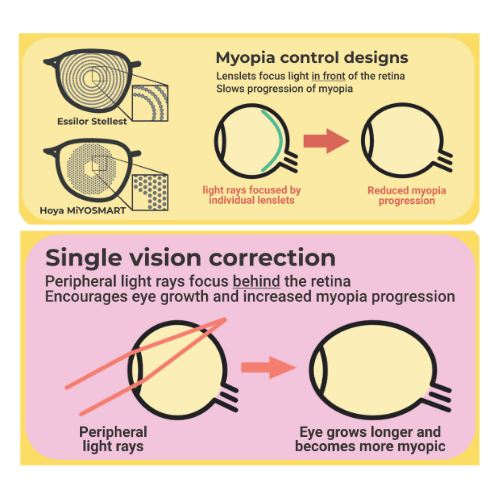 Myopia control glasses redirect peripheral light to reduce stimulation and axial growth of the eyes. This signals the brain to slow the growth of the eyes, which is the main cause of progressive myopia.